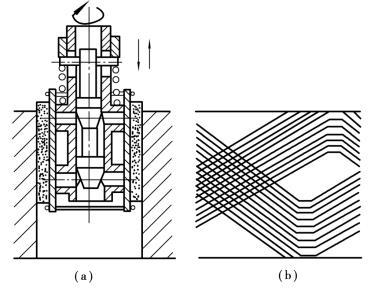 珩磨方法如圖5.4.2所示。工件安放在珩磨機的工作臺上或安裝在夾具上。珩磨頭由機床主軸帶動旋轉并作往復軸向移動。油石以一定的壓力與孔壁接觸,即可切去一層極薄的金屬。為了獲得較低的粗糙度,切削軌跡應成均勻而不重復的交叉網(wǎng)紋。為了使油石與孔壁均勻接觸,獲得較高的形狀精度,珩磨頭與機床主軸一般應浮動連接,以便珩磨頭沿孔壁自行導向。