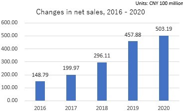 -2020年初,COVID-19疫情導致全球汽車銷量整體下滑,但受汽車行業電動化熱潮以及中國對新能源汽車購置免稅、補貼等消費促進政策的影響, 2020年實現銷售額503.19億元,同比增長9.90%。如下表(右)所示,2016-2020年銷售額持續增長;2020 財年的銷售額是 2016 財年的 2.39 倍。
