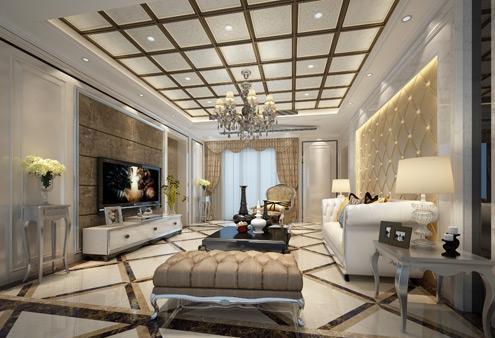 客廳吊頂采用網格形式設計,與地面大理石瓷磚呈呼應之態。線條感極強,干凈利落。不銹鋼線條吊頂在嵌入的筒燈照射下,為整個家居空間增添了一絲清冷的硬朗氣質。