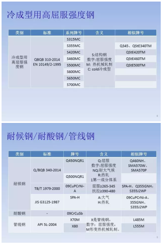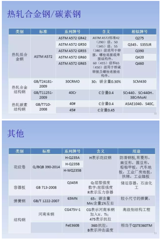 客觀地說,GB/T 221使用更為廣泛。標準里規定,我國鋼鐵產品牌號采用大寫漢語拼音字母、化學元素符號和阿拉伯數字相結合的方法來表示。為了便于國際交流和貿易的需要,作為漢語拼音字母的補充,也采用大寫英文字母或國際慣例表示符號。