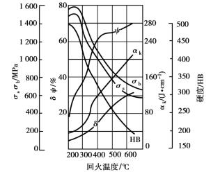 圖1.4.23 40鋼回火溫度對力學(xué)性能的影響