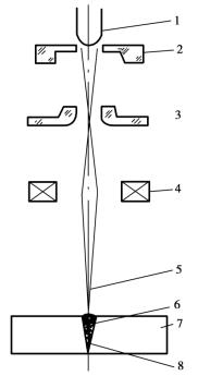 電子束焊接的定義 2019-07-0510:39:01電子束焊接的定義已關閉評論電子束焊接方法(圖4.3.5)屬于高能密度焊接方法。其特點是焊接時的能量密度大,可以焊出寬度小、深度大的焊縫,熱影響區以及焊接變形很小。電子束焊在真空中進行,焊縫受到充分保護,能保證焊縫金屬的高純度。電子束焊以前多用于航空航天、核工業等部門,焊接活性材料及難熔材料。現已應用在汽車制造、工具制造等工業,如焊接汽車大梁及雙金屬鋸條等。圖4.3.5 電子束焊原理1—陰極 2—控制板 3—陽極4—電磁透鏡 5—電子束6—聚焦束 7—工件 8—焊縫 贊 0 分享
