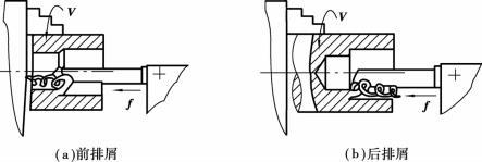 鋼件上鏜孔時,切屑的流向對孔的加工質量影響較大。精鏜通孔時,最理想的是圖5.2.6 (a)所示的前排屑方式。鏜刀刃傾角取正值,切屑流向待加工表面,從孔的前端口排出,避免切屑劃傷已加工表面。精鏜盲孔時,為避免切屑堆積在孔內破壞已精加工的表面,一般采用圖5.2.6(b)所示的后排屑方式。這時,刃傾角取負值,使切屑順利從孔口及時排出。