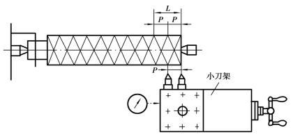 ①移動小刀架法 移動小刀架法如圖5.2.19所示。首先校正小刀架導軌,使之與工件軸線平行。按螺紋導程L調整車床,車出第一條螺紋槽,然后讓車刀沿工件軸向移動一個螺距值,即可車削第二條螺紋槽,類推。若多線螺紋的螺距要求不高,可直接利用小刀架手柄刻度盤控制移動量;若螺距要求較高,可用百分表控制小刀架的移動量。應當指出,移動小刀架時與當時小刀架所處的軸向位置無關。