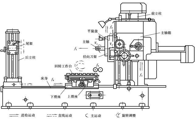 平旋盤(pán)如圖5.2.35所示,其安裝在主軸外邊,可作旋轉(zhuǎn)主運(yùn)動(dòng)V2。上面裝有徑向刀架,刀具可沿徑向?qū)к壸鲝较蜻M(jìn)給運(yùn)動(dòng)f2