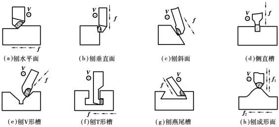 平面刨削方法在實習中已學習過,這里僅介紹V形槽和燕尾槽的刨削方法。V形槽和燕尾槽是機器零件上較常見的兩種槽形,它們多用做導軌配合面。
