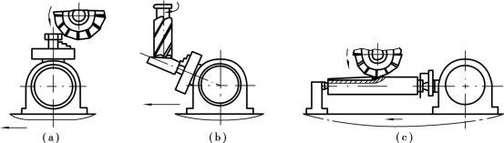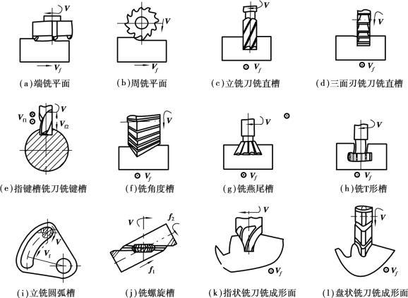 銑床的主要方法如圖5.2.58所示。銑削一般分為粗銑和精銑。粗銑的尺寸精度等級可達(dá)IT13~I(xiàn)T11,表面粗糙度R a可達(dá)12.5;精銑的尺寸精度等級可達(dá)IT9~I(xiàn)T7,表面粗糙度R a可達(dá)3.2~1.6。硬質(zhì)合金鑲齒端銑刀銑削大平面的直線度可達(dá)(0.04~0.08)mm/m。